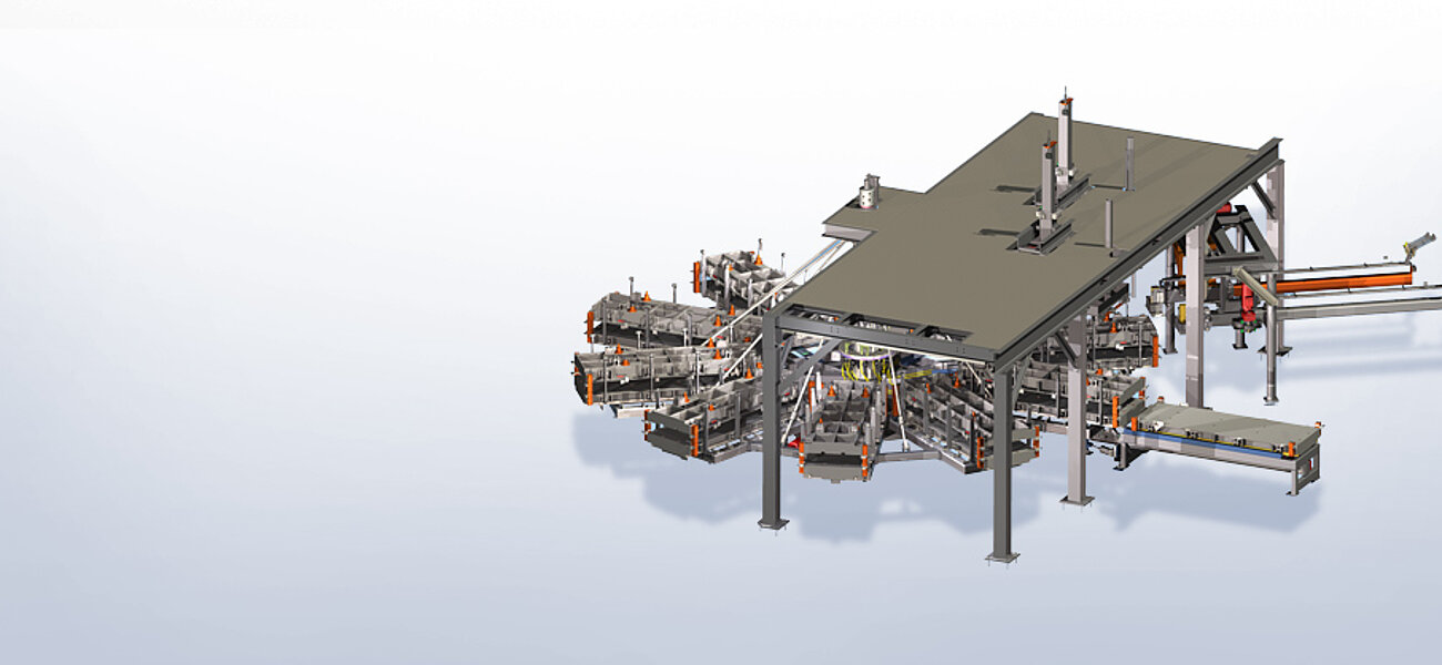 Zur Aufnahme der einzelnen Formenträger dienen gleichmäßig verteilte Konsolen, in denen die Formenträger verfahrbar aufliegen und positioniert sind. Das Rüsten der Anlage erfolgt im Arbeitstakt.